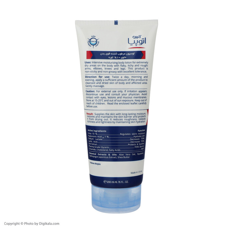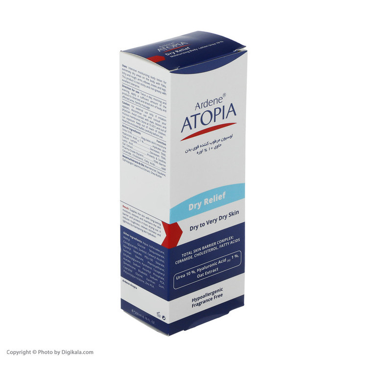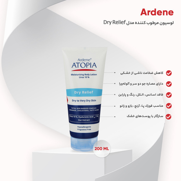 لایهبرداری این محصول را به Urea آن مدیونیم. این ترکیب در مقادیر 10-20 درصد، اثر کراتولیتیک (لایه برداری) دارد. در کنار اوره، اسید لاکتیک را داریم که جدا از اثر لایهبرداری خفیفی که دارد، فرآیند عمل اوره را نیز بهبود میبخشد. لاکتیک اسید بعد از تخریب سد دفاعی پوست به دلیل خاصیت هیدروفیلی (آب دوست) در کنار لایهبرداری، مانع از هدر رفت رطوبت پوست نیز میشود. لوسیون بدن مرطوب کننده قوی اتوپیا آردن مدل Dry Relief با ترکیبات مرطوبکننده و آبرسان بسیار دیگری فرموله شده است. این مواد، به مدت طولانی پوست را مرطوب نگه میدارند. با تامین چربی و آب مورد نیاز پوست، زبری، خشکی، حالت فلسی و پوستههای آن رفع میشود. همچنین علائم خشکی، خارش و زبری آن را به حداقل میرساند. این محصول، یک لوسیون تسکیندهنده و التیامبخش نیز هست. لوسیون بدن اتوپیا آردن یک نرمکننده (امولیانت) فاقد الکل، اسانس، پارابن و رنگ است. تکنولوژی فرمولاسیون آن بهطوریست که در عین رطوبترسانی قوی، هیچگونه اثر چربی اضافه روی پوست برجای نمیگذارد. زیرا ساختار آن سبک طراحی شده و جذب آن نیز سریع است. همچنین این محصول کمدونزاست در نواحی مستعد مانند بازو و باسن باعث ایجاد جوش نمیشود.